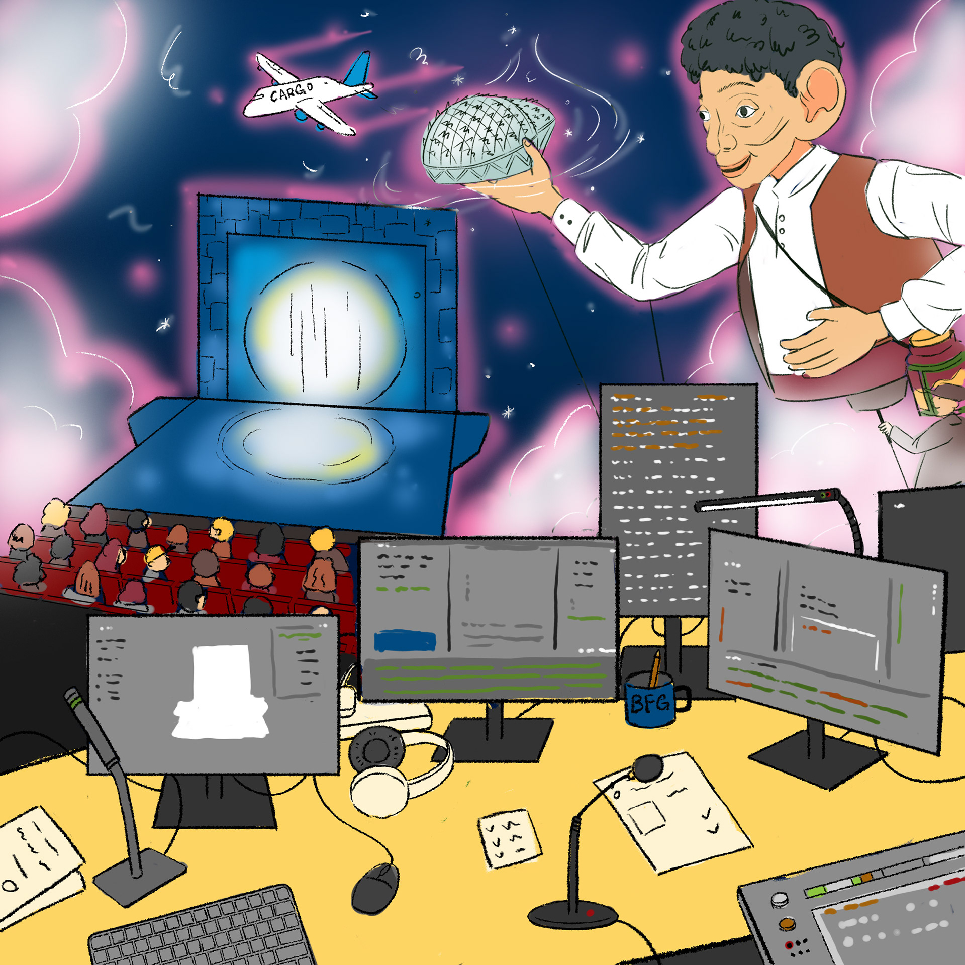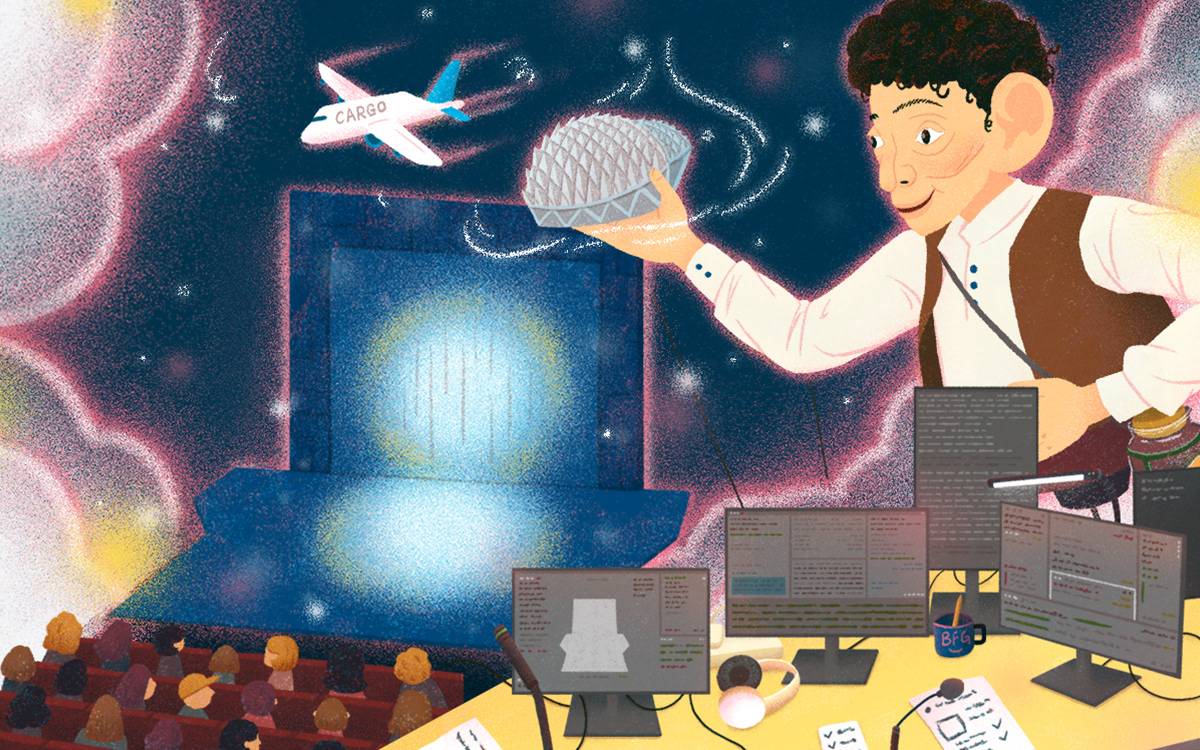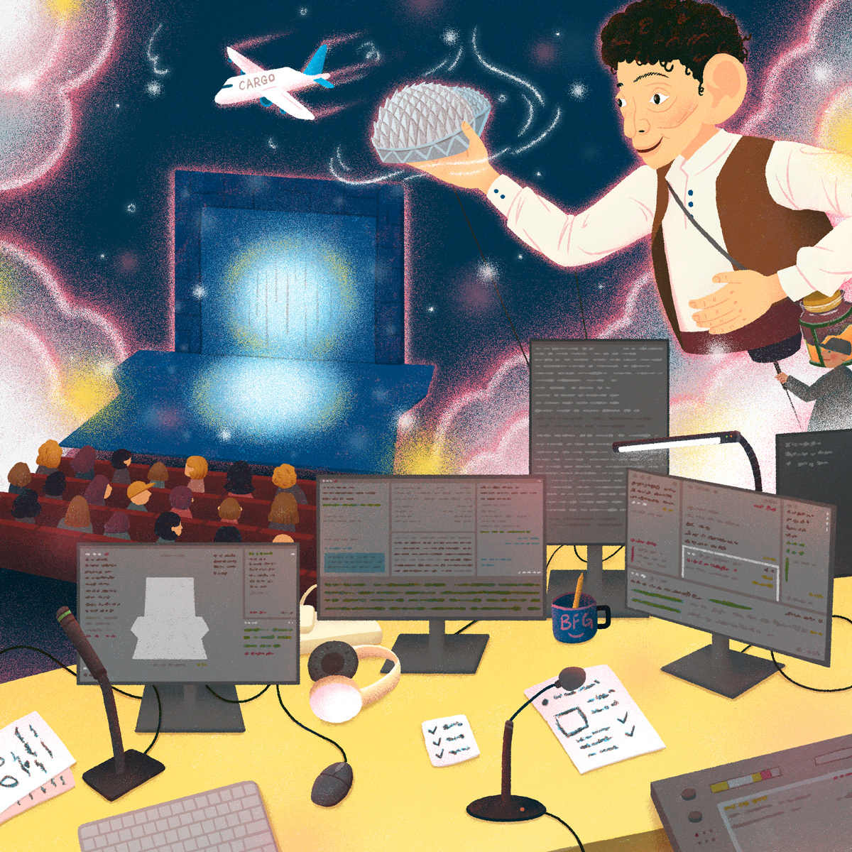 KV2 focuses on the backstage process, featuring lighting systems, sound equipment, set design, and technical elements. The composition brings together these components in a slightly surreal, dreamlike way — referencing the idea of “capturing” different parts of the production, similar to how dreams are collected in The BFG.