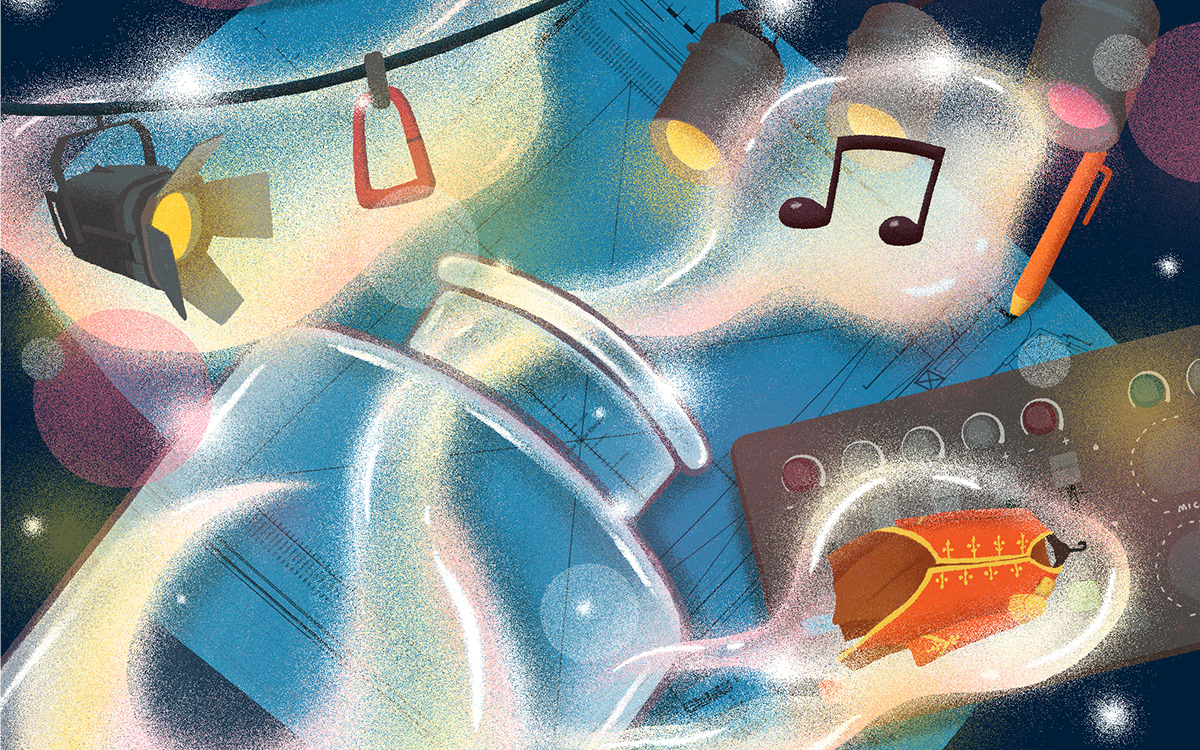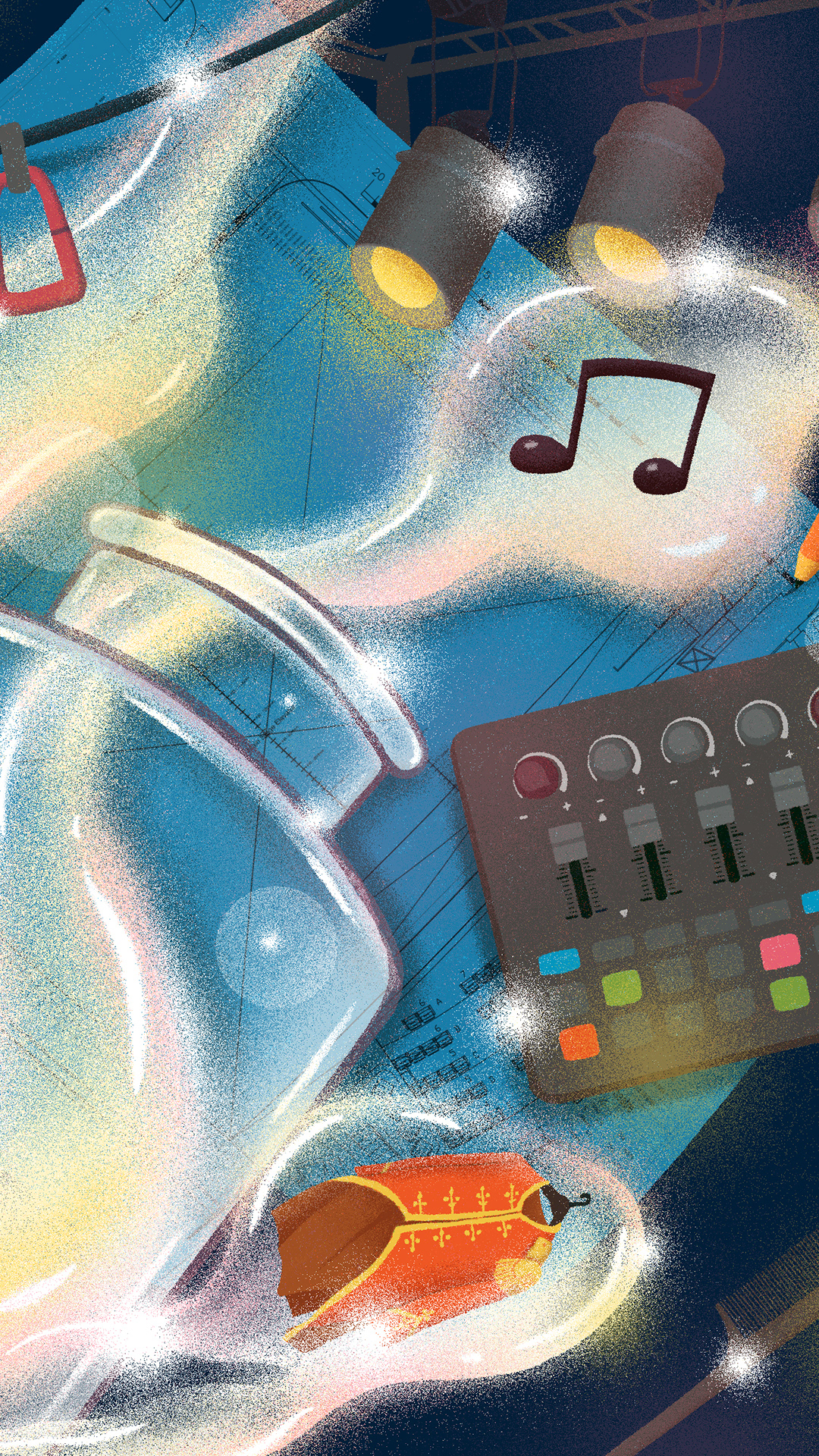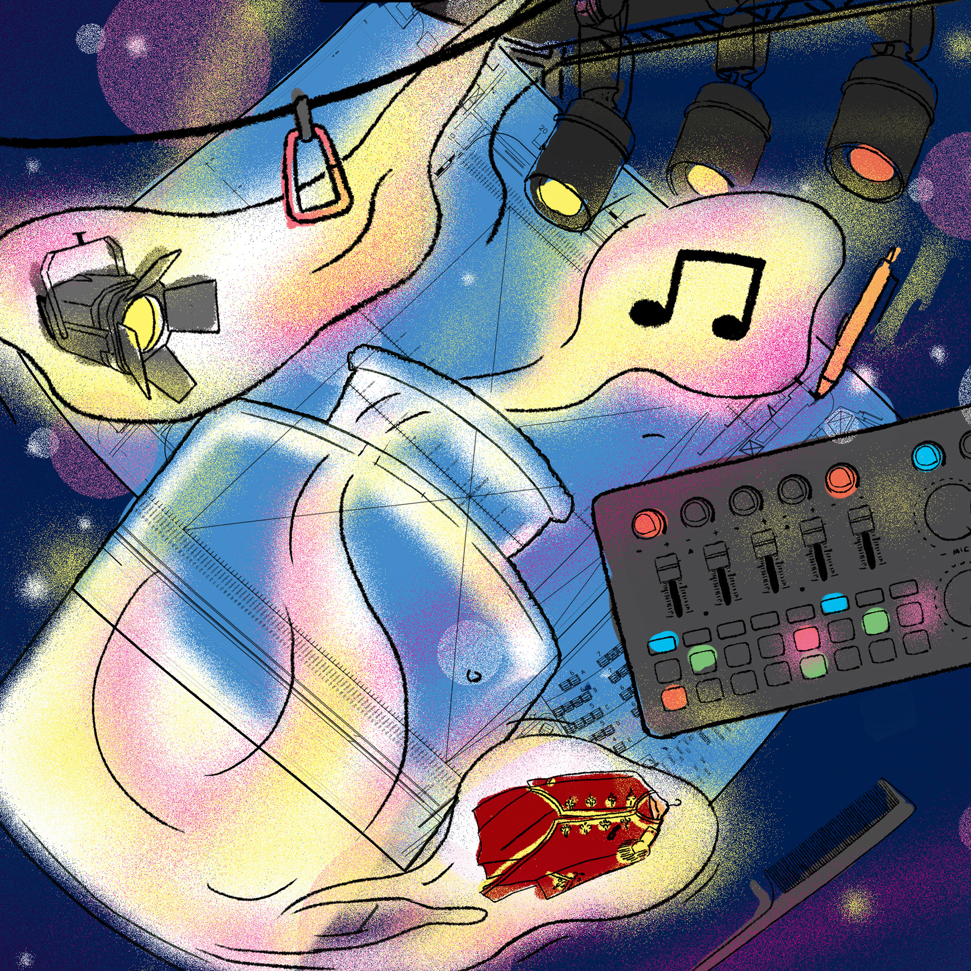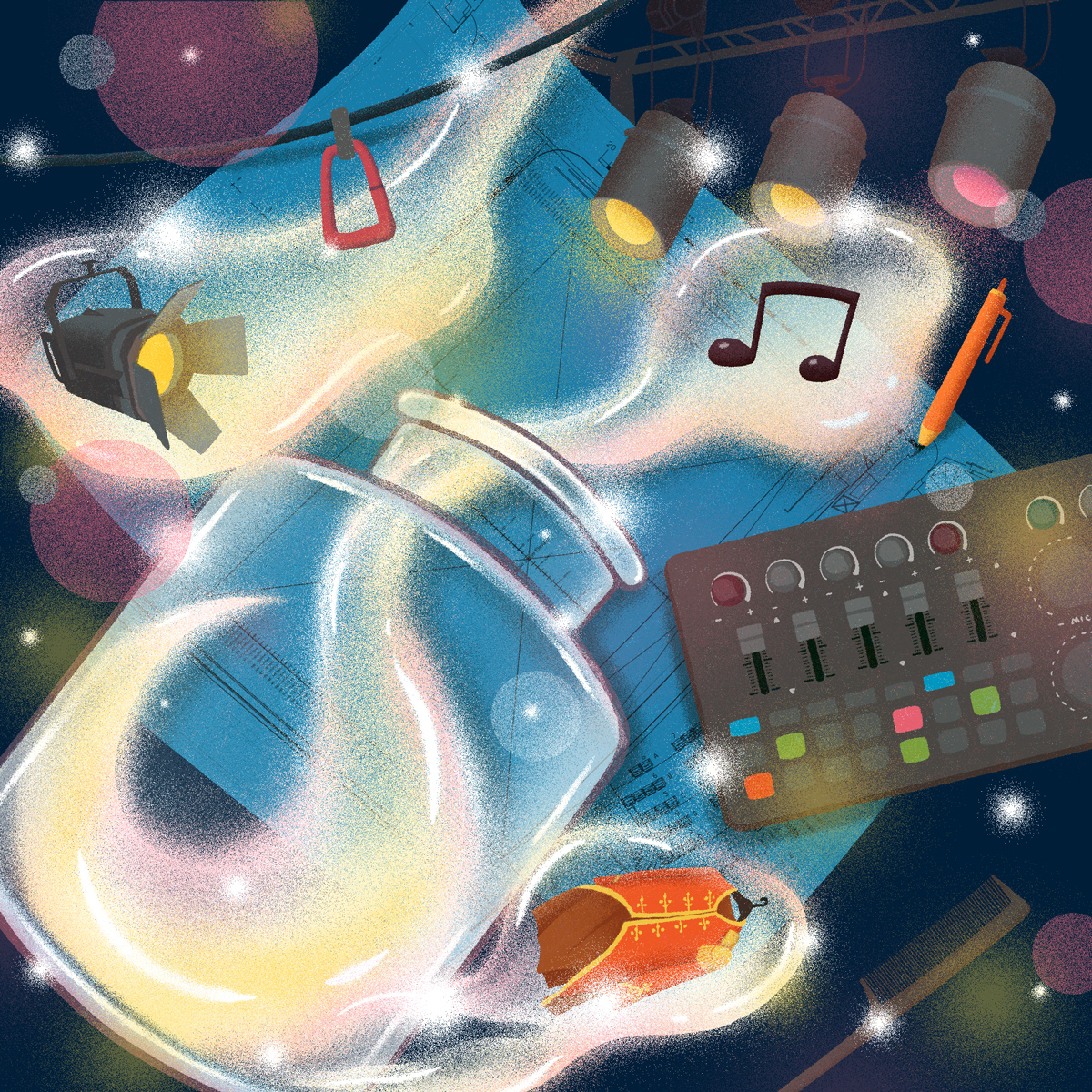 KV2 focuses on the backstage process, featuring lighting systems, sound equipment, set design, and technical elements. The composition brings together these components in a slightly surreal, dreamlike way — referencing the idea of “capturing” different parts of the production, similar to how dreams are collected in The BFG.