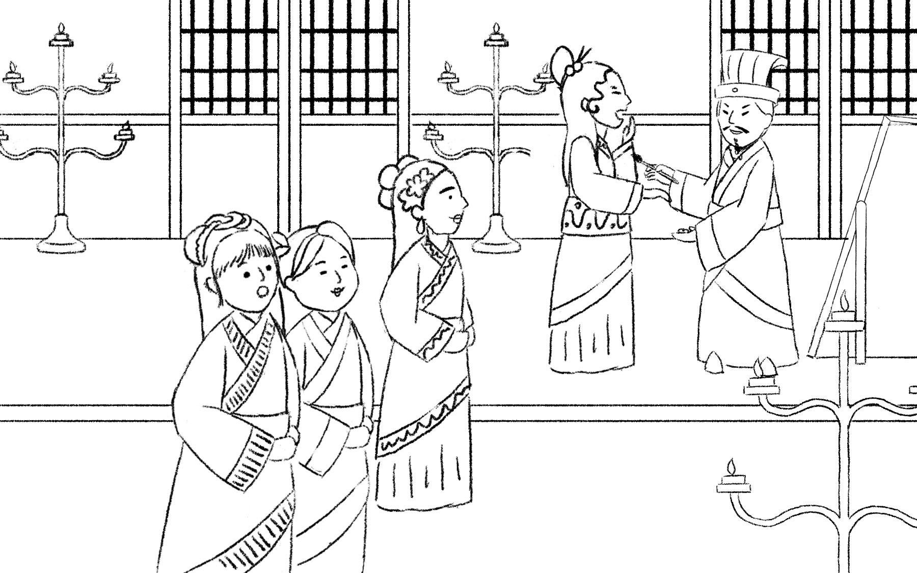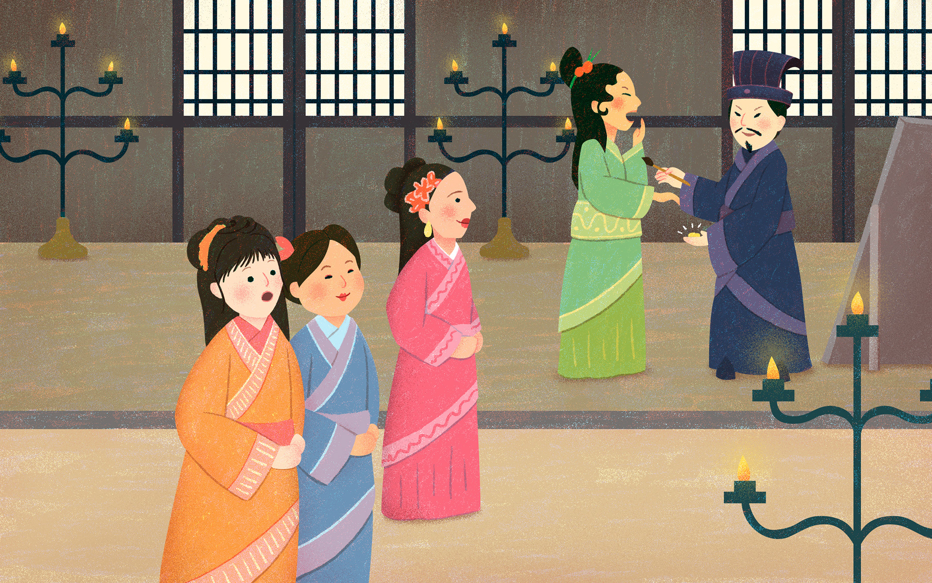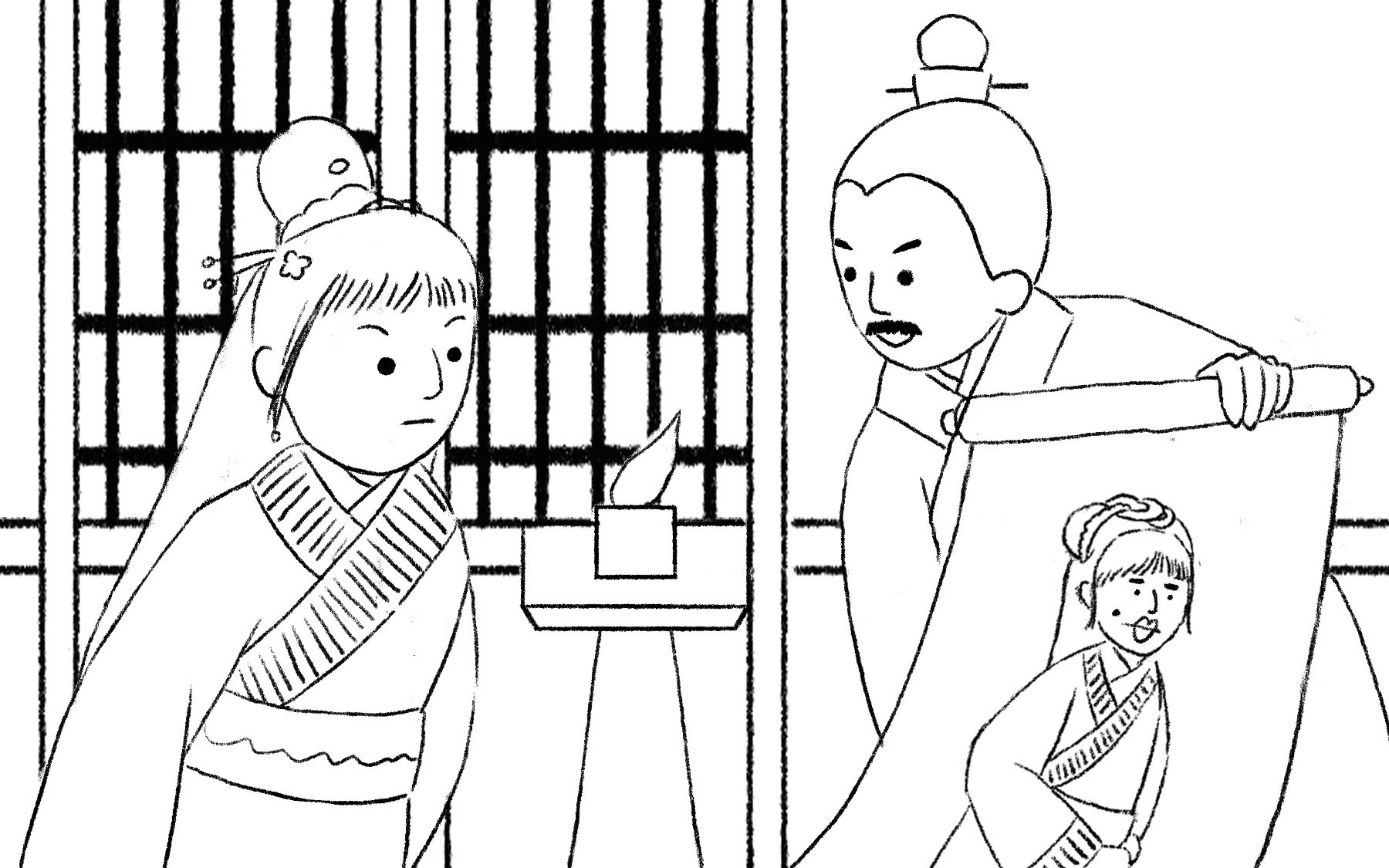When Zhaojun arrived at the place, she and other young ladies were ushered into a room to have their portraits drawn. The emperor would use these portraits to decide who would serve him as a court lady. Those not selected remained as ladies-in-waiting instead.